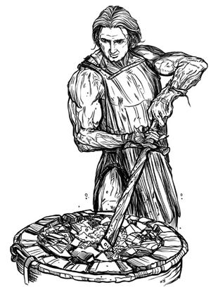 Orich is a barrel chested man with burn scars on his well muscled arms. Friends with Cormir from their years of service with the Iron Legion, Orich had retired a few years earlier to the village of Tomar's Crossing, where he has married a younger woman and started a family and taken up the role of village blacksmith (and armourer).